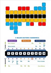Our harmonica maps for 4 hole and 10 hole harmonica are the ideal reference guide for understanding the layout of the diatonic harmonica. Each map comes in two parts. Firstly, a colour coded block chart mapping blow notes, draw notes, standard bends and overbends. Secondly, a more detailed diagram, showing note names and their respective positions.